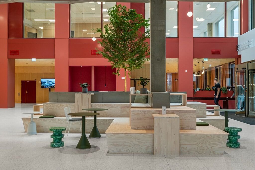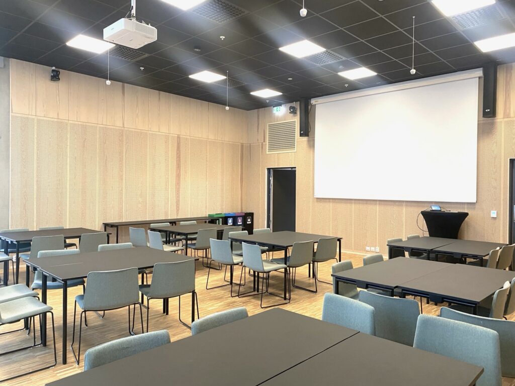 Bord og stoler har fast oppsett ved møtestart i Flerbruksrommet, 7 gruppebord med 6 stoler. Leietaker kan selv ommøblere bord og stoler slik de selv vil. Skal det ommøbleres: husk å legg inn ekstra leietid til dette før og etter møte.